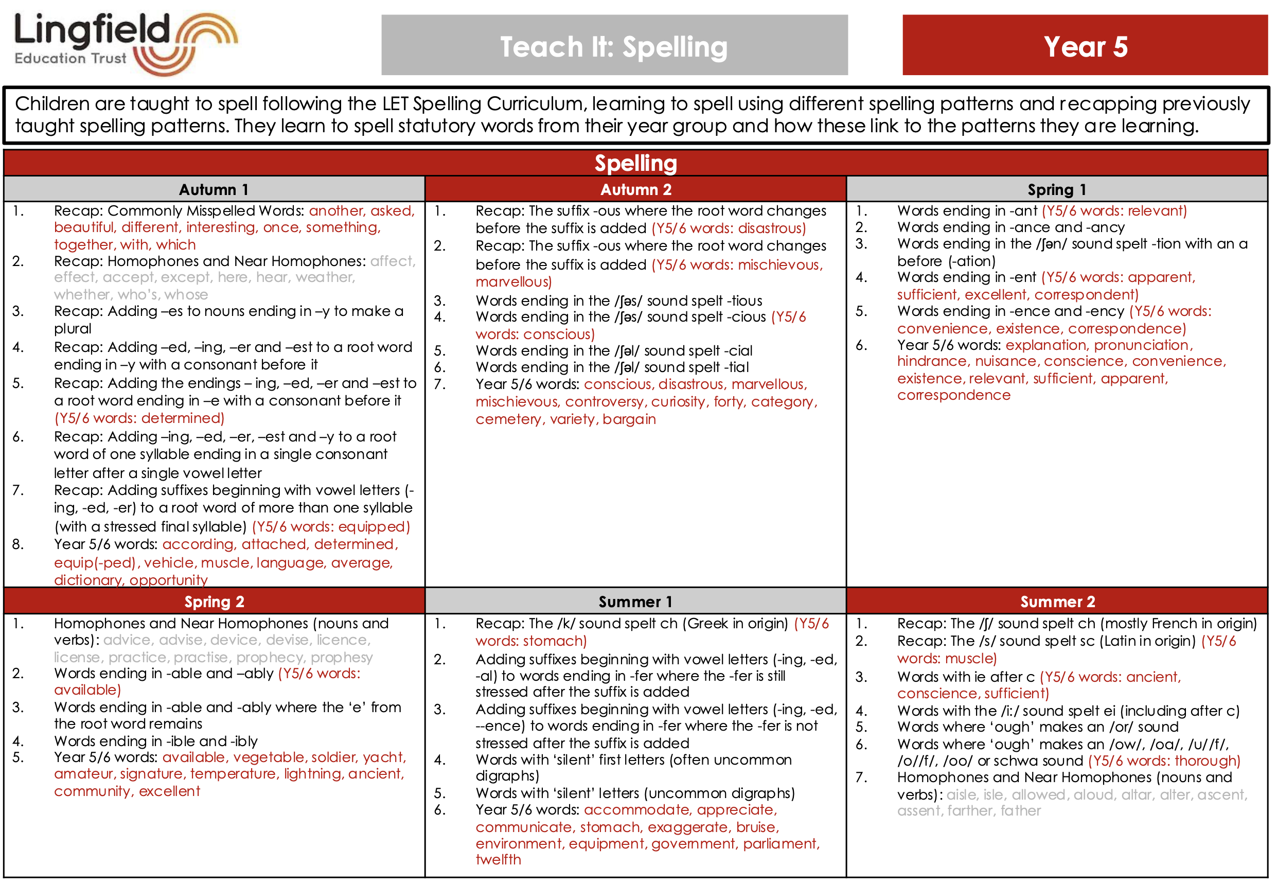 We apply a systematic approach to spelling.  Here is an overview of our Year 5 spelling:​